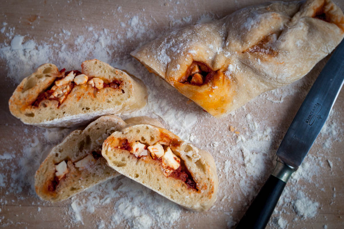Zuerst den Vorteig ansetzen. Dafür Hefe in ca. 300ml warmem Wasser auflösen. So viel Mehl dazu geben und verrühren bis ein dünner, pfannkuchenartiger Teig entsteht. Den Vorteig eine Stunde gehen lassen und jede halbe Stunde umrühren. Salz und restliches Mehl hinzugeben. Den Teig bis zu 3 Stunden gehen lassen und jede halbe bis Dreiviertelstunde wiederholt durchkneten. Für die Füllung die Schalotte und etwas Ingwer kleinschneiden und anbraten. 75g Tomatenmark, eine Messerspitze Sambal Oelek, italienische Kräuter und etwas Preiselbeeren hinzufügen. So viel Wasser hinzugeben bis eine zähflüssige Konsistenz entsteht und mit Salz und Pfeffer abschmecken. Den Teig auf ein Backblech geben und drei flache ovale Baguettes daraus formen. Die Sauce auf den Teig geben und den Schafskäse mit den Fingern grob zerbröseln und darüber streuen. Zum Schluss die Füllung mit dem Teig umschließen und die Baguettes für 25 Minuten bei 200° im Ofen backen.