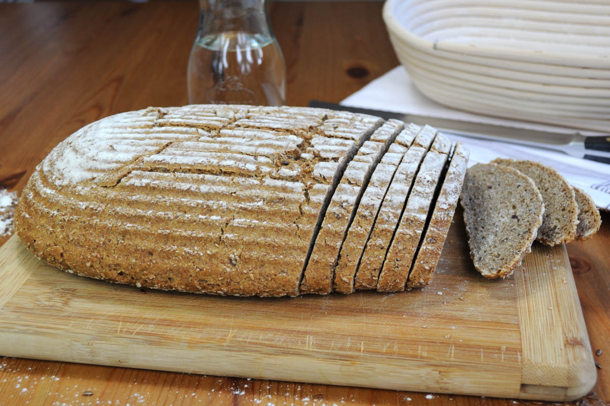 Für den Vorteig die Hefe in warmem Wasser auflösen. So viel Mehl dazu geben und verrühren bis ein dünner, pfannkuchenartiger Teig entsteht. Den Vorteig eine Stunde gehen lassen und jeweils nach einer halben Stunde umrühren. In der Zwischenzeit Leinsamen und Sesam rösten und zusammen mit dem Salz und dem übrigen Mehl vermengen. Nach einer Stunde das Mehlgemisch aus Salz, Sesam und Leinsamen Stück für Stück zum Vorteig dazugeben und kräftig durchkneteten. Der Teig sollte noch klebrig sein, deshalb sollte je nach Bedarf noch etwas Wasser hinzugegeben werden. Den Teig bis zu vier Stunden gehen lassen, jede halbe bis Dreiviertelstunde wiederholt durchkneten und danach noch einmal eine Stunde im Gärkörbchen gehen lassen. Das Gärkörbchen auf einem Backblech umstülpen und den Teig im Ofen zusammen mit einer großen Wasserschale eine halbe Stunde bei 250° backen. Danach eine Viertelstunde bei 200° und eine letzte Viertelstunde bei 175° ohne die Wasserschale. Danach kann das fertige Brot aus dem Ofen genommen werden und abkühlen.