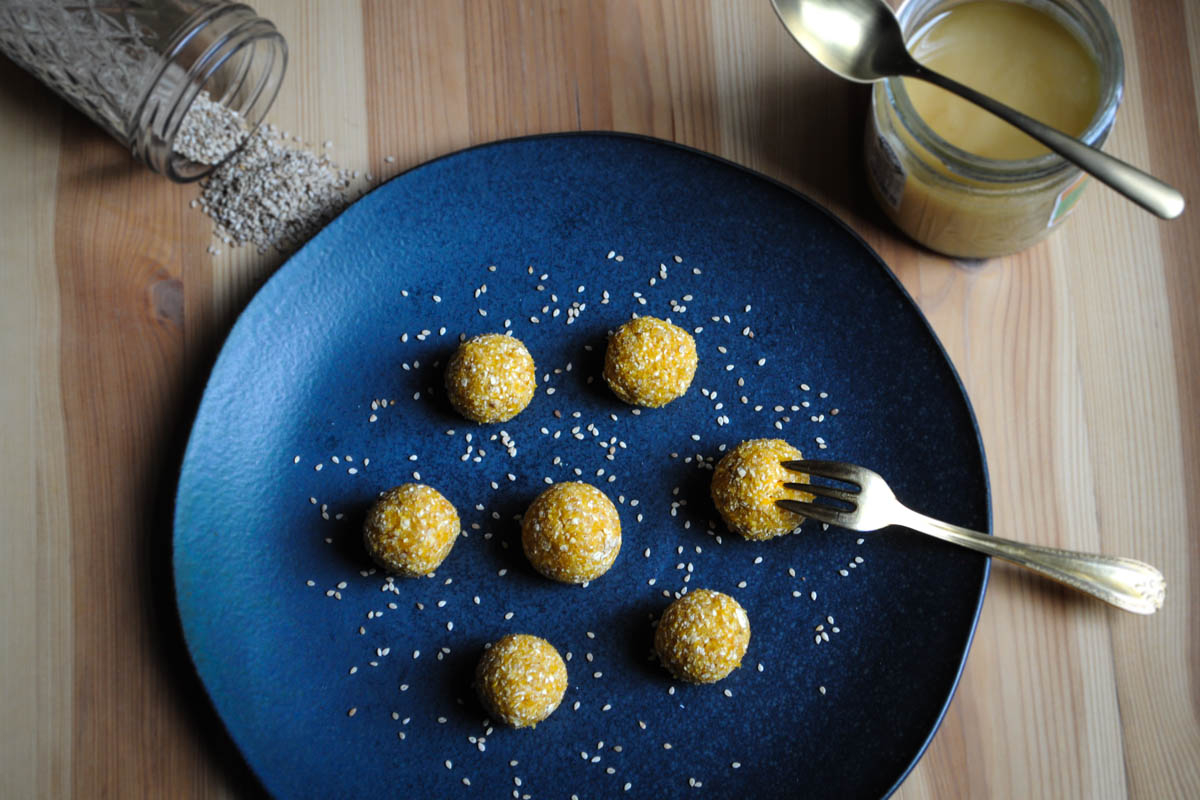 Diese energiereiche Frühstücksidee aus getrockneten Aprikosen und Haferflocken ist super lecker und schnell gemacht. Vermenge einfach 100g getrocknete Aprikosen oder andere Trockenfrüchte mit 30g zarten Haferflocken, gebe einen Teelöffel Honig oder Ahornsirup, etwas Sesamöl und eine Prise Salz hinzu und vermenge alles in einem Mixer. Nun kannst du je nach Belieben kleine oder große Kugeln daraus formen und zum Schluss noch ein paar Sesamkörner darüberstreuen. Lasse sie eine Viertelstunde im Kühlschrank für die perfekte Konsistenz!