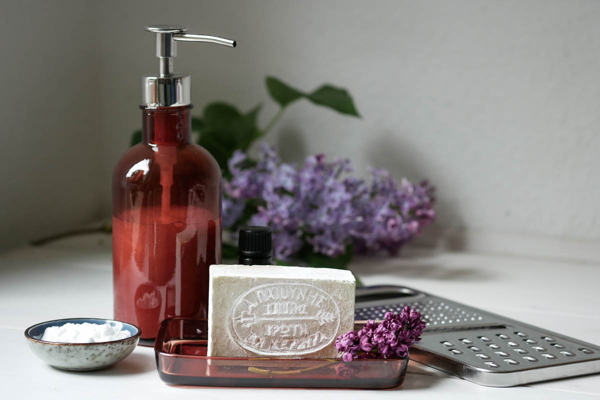 Zunächst benötigst du entweder bereits fertige Seifenflocken oder ein Stück (Olivenöl-)Kernseife, das auf einer Reibe in kleine Flöckchen geraspelt wird. Anschließend werden in einem Topf ca. 400ml. Wasser zum kochen gebracht und die Seifenflocken sowie 1 EL Natron darin aufgelöst. Je nach Belieben können außerdem zwei bis drei Tropfen ätherische Öle hinzugegeben werden. Zum Schluss muss das heiße Gemisch nur noch in eine Pumpflasche gefüllt werden und fertig ist das biologisch abbaubare Spülmittel.