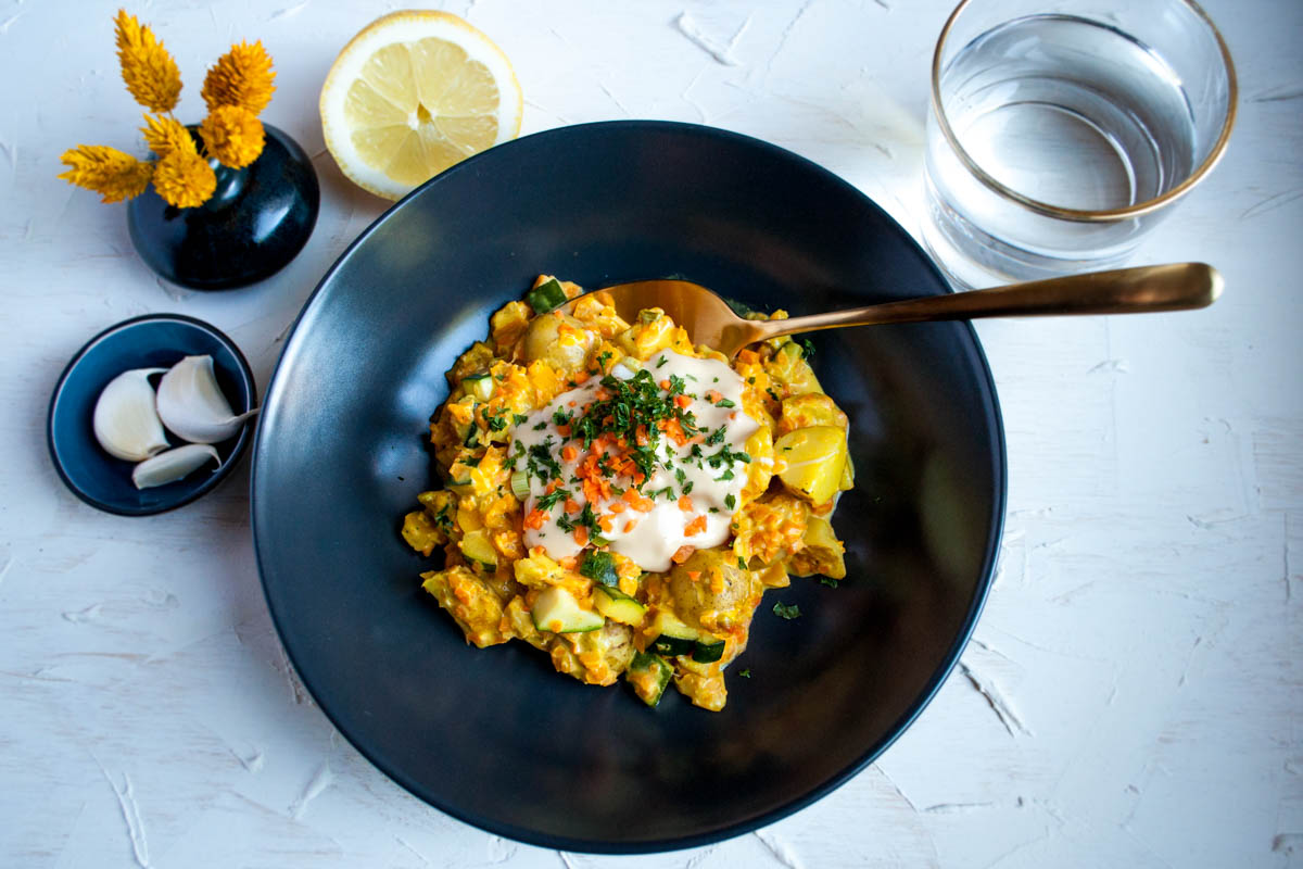 Zuerst die Kartoffeln schälen oder waschen und in mittelgroße Würfel schneiden. Wasser zum Kochen bringen, salzen, die Kartoffel hinzugeben und ca. 15 Minuten kochen bis sie gar sind aber noch etwas Biss haben. In der Zwischenzeit die Möhren und den Knoblauch in einem Mixgerät zerkleinern oder auf einer Reibe raspeln. Die Schalotte und Zucchini in kleine Würfel schneiden. Anschließend etwas Öl in einer Pfanne erhitzen und darin die Schalotte glasig dünsten. Kurz danach den Möhren-Knoblauch-Mix hinzugeben und anbraten. Zuletzt die Zucchini dazugeben und ebenfalls anbraten. Mit Curry, Kurkuma und Pfeffer würzen und nach kurzer Zeit mit einem Schuss Weißwein ablöschen. Einen halben Teelöffel Gemüsebrühe mit etwas heißem Wasser, einem halben Esslöffel Honig, drei Esslöffeln Mandelmus, etwas Sojasauce und drei Esslöffeln Soja Cuisine verrühren und über das Gemüse gießen. Das Ganze bei geschlossenem Deckel etwas köcheln lassen und zuletzt die fertigen Kartoffeln dazugeben. Mit etwas Petersilie bestreuen und fertig ist die leckere Kartoffelpfanne!