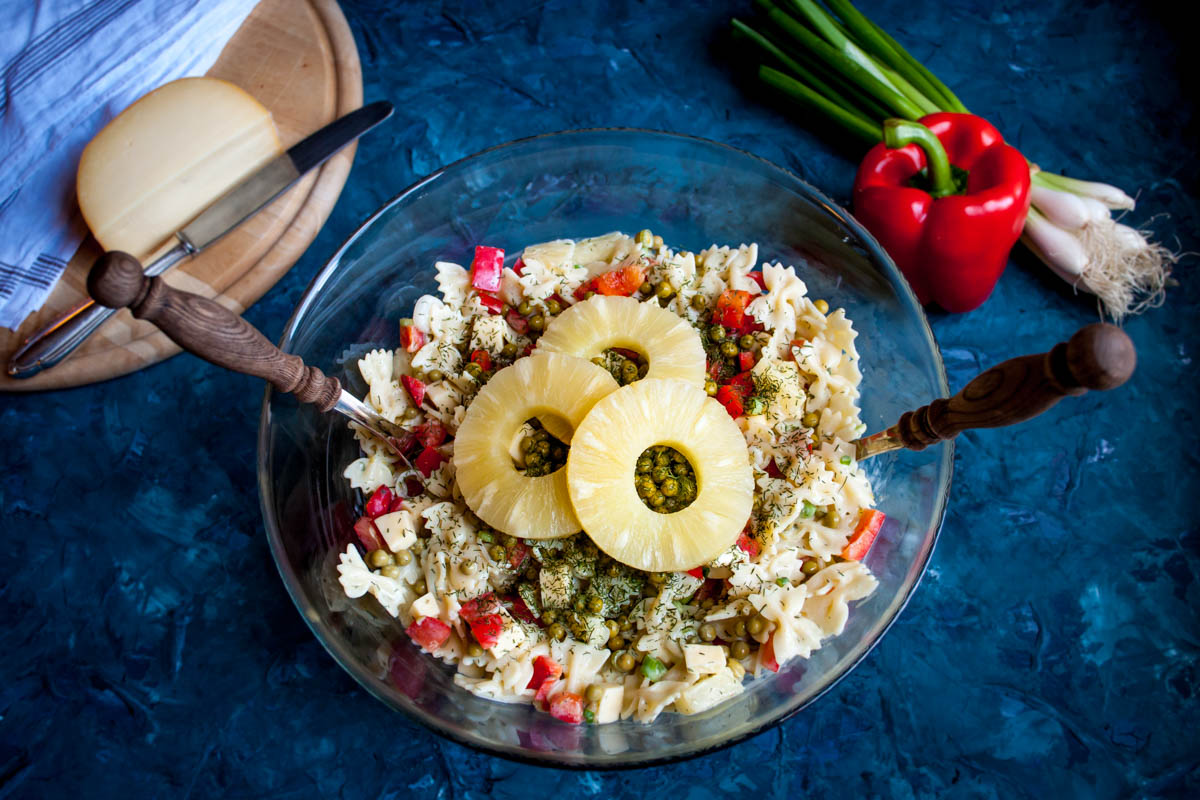 Die Nudeln in reichlich Salzwasser garen, abgießen und kalt abspülen. In einer Schüssel ein Glas Mayonnaise mit fünf Esslöffeln Joghurt, einem Teelöffel Sojasauce und Senf verrühren. Vier bis fünf Esslöffel Ananassaft hinzugeben und mit Curry, Pfeffer und Muskat würzen. Die Frühlingszwiebeln in Ringe, den Käse in kleine Würfel und die Paprika in mittelgroße Stücke schneiden. Danach die Nudeln zusammen mit der Ananas, den Erbsen und Frühlingszwiebeln, der Paprika und dem Käse in eine Schale geben, die Sauce unterrühren und bis zum Servieren kaltstellen.