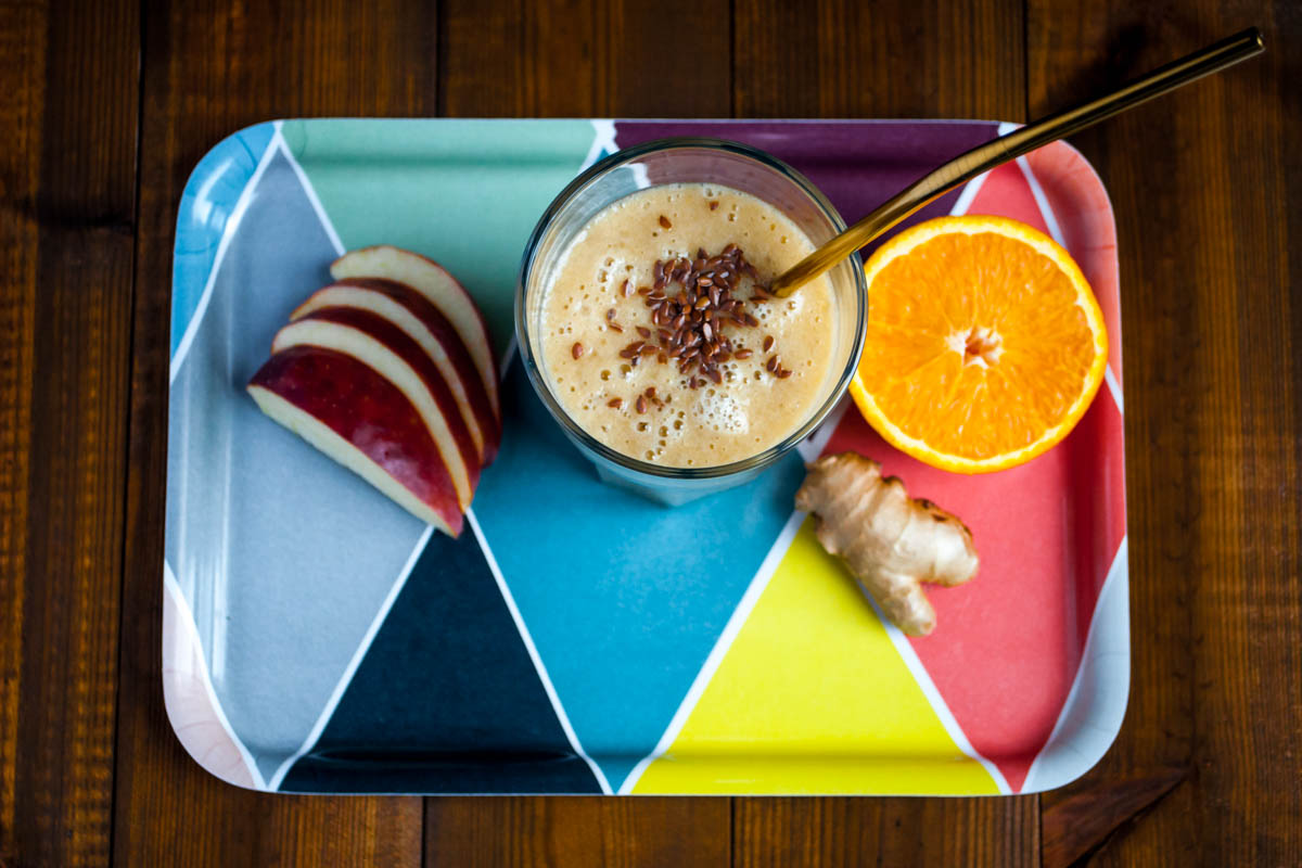 Für diesen minimalistischen Smoothie werden eine halbe Banane, ein Apfel, ein paar Leinsamen und ein Stück Ingwer mit einem Pürierstab oder Mixer zerkleinert und mit dem Saft von zwei Orangen aufgefüllt bis eine zähflüssige Smoothie-Konsistenz entsteht.