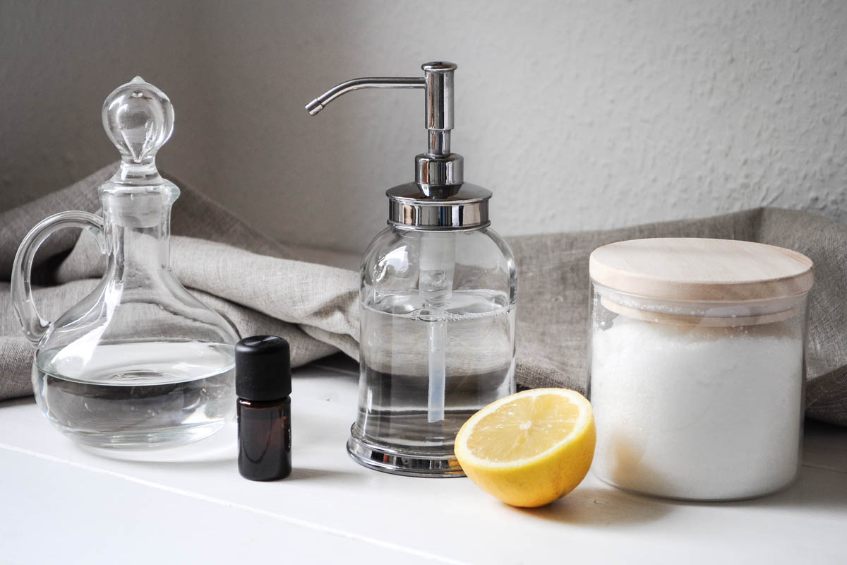 Essig und Wasser sind die Grundinhaltsstoffe eines effektiven und umweltfreundlichen Allzweckreinigers. Vermische einfach vier Teile Essig mit zwei Teilen Wasser in einer Sprühflasche und gib ein paar Tropfen Zitronen-, Lavendel- oder andere ätherische Öle deiner Wahl hinzu - diese wirken antibakteriell und riechen zudem super gut. Falls du Essigessenz benutzt solltest du mehr Wasser hinzugeben, da der Reiniger sonst zu stark wird. Eine gute Alternative zu Essig, insbesondere im Bad, ist Citronensäure, denn Essig kann Dichtungen aus Gummi oder Silikon angreifen und sie porös machen.