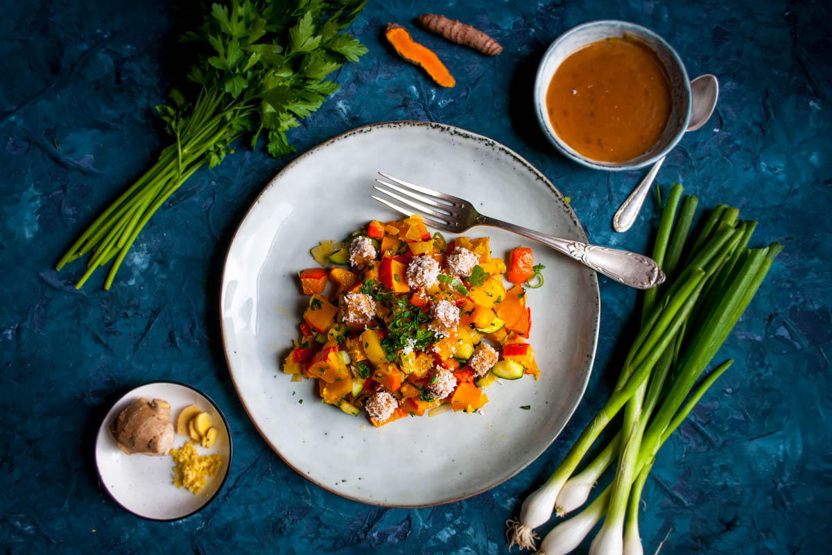 Als erstes den Kürbis in kleine Würfel schneiden und in einer großen Schüssel mit Erdnussöl, Salz, Pfeffer und Kurkumapulver vermischen. Auf einem Backblech verteilen und für ca. 20 Minuten bei 240° in den Ofen geben. Als nächstes den Tofu für ca. 20 Minuten in etwas Salzwasser (ca. 1 TL Salz) einlegen. Danach das Gemüse – die Zwiebel, Paprika und Zucchini – in einem Wok anbraten und mit Ingwer, Salz und Pfeffer würzen. Nach 20 Minuten die Kürbis-Würfel aus dem Ofen nehmen und zum Wok hinzugeben. Den Tofu in kleine Würfel schneiden und scharf anbraten bis er knusprig ist. Dann etwas Erdnussmus dazugeben, die Pfanne vom Herd nehmen und den Tofu in einer Hand voll Kokosraspeln wälzen bis eine Panade entsteht. Für die Sauce Kokosmilch, Sojasauce und Ahornsirup in einem kleinen Topf erhitzen und mit Salz und Pfeffer abschmecken. Alles getrennt servieren oder den Tofu zur Sauce dazugeben. Mit etwas Petersilie bestreuen und fertig ist die leckere Kürbis-Pfanne mit nussigem Tofu!
