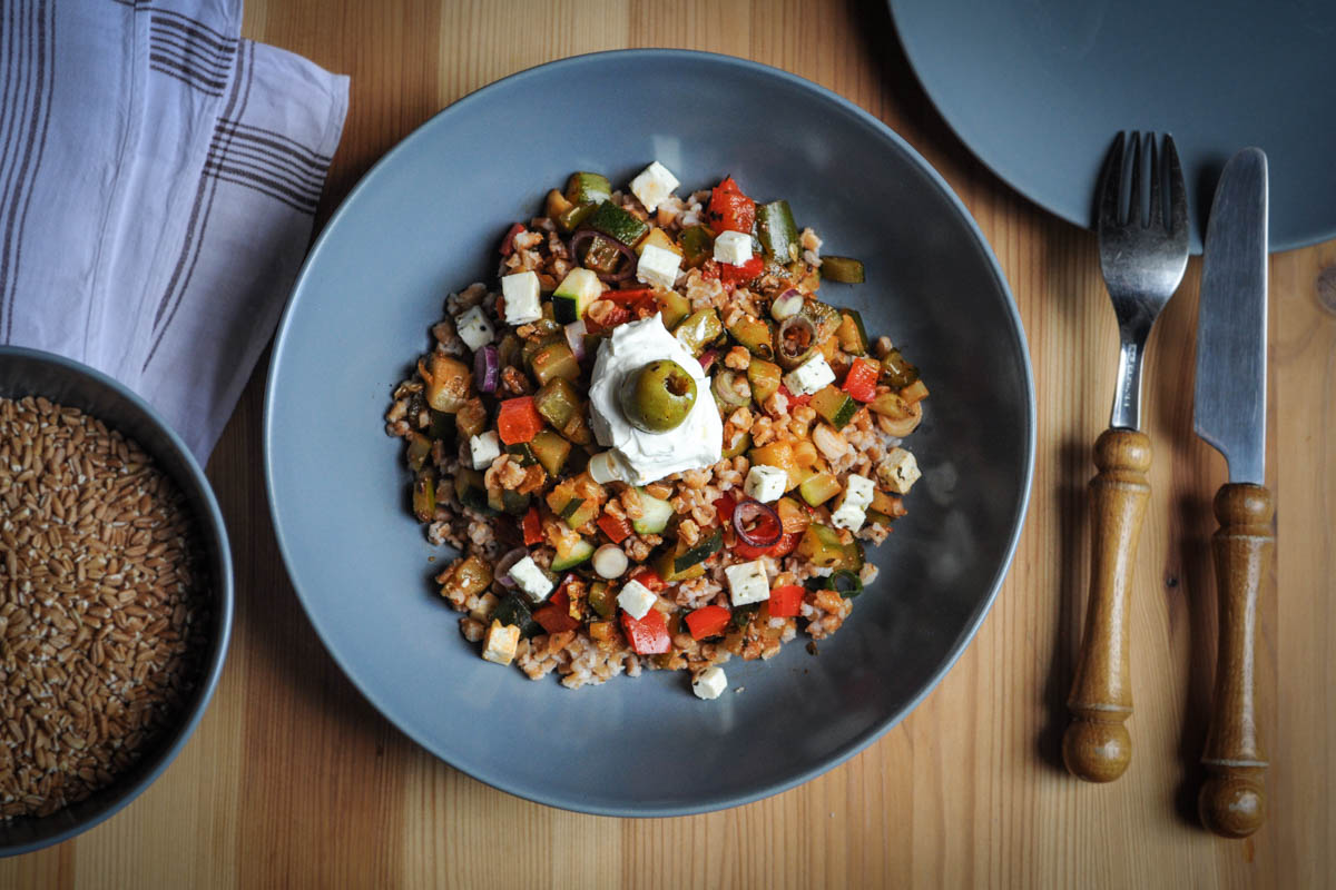 Den Dinkel mit der doppelten Menge Wasser und etwas Salz in einem Topf bei schwacher Hitze ca. 20 Minuten köcheln lassen. Der Dinkel ist fertig, wenn er noch ein klein wenig Biss hat und kein Wasser mehr im Topf ist. Während der Dinkel zieht, das Gemüse und die Oliven kleinschneiden und die Frühlingszwiebeln In einer Pfanne glasig dünsten. Zucchini und Paprika hinzugeben und scharf anbraten. Mit Kräutern der Provence und Pfeffer würzen und nach ca. 3 Minuten etwas Tomatenmark und Agavendicksaft hinzugeben. Nach weiteren 2 Minuten die Pfanne vom Herd nehmen. Oliven und etwas Fetakäse bzw. veganen Käseersatz vorsichtig unterheben und unter den Dinkel heben. Dazu passt z.B. Lupinenjoghurt oder veganer Schmand-Ersatz.