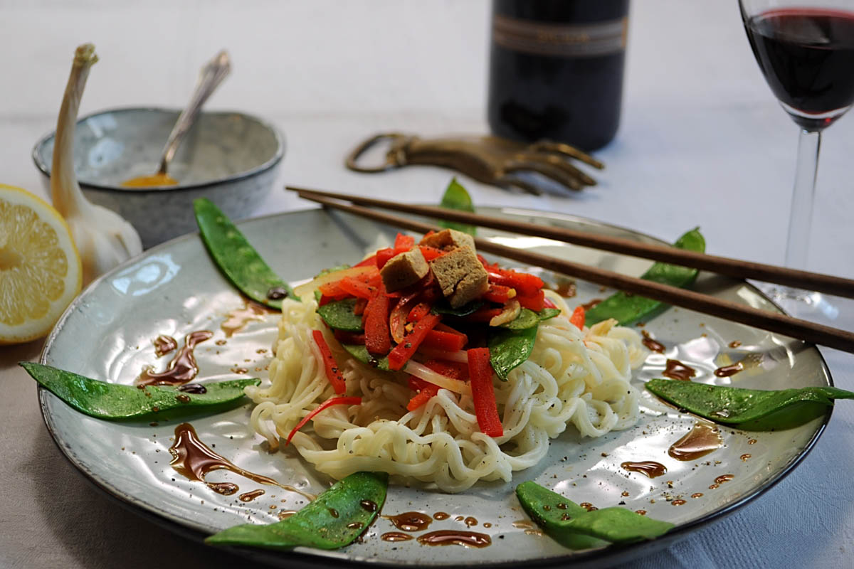 Kaiserschoten und Paprika waschen. Zwiebeln und Paprika in feine Ringe schneiden, Knoblauch und Zitronengras kleinhacken. Mie-Nudeln nach Packungsanweisung garen. Währenddessen Sesamöl mit Zwiebeln, Knoblauch und Ingwer in einem Wok erhitzen. Schoten und Paprika zusammen mit dem Honig hinzugeben und etwas karamellisieren. Mit Sojasauce ablöschen und etwas Pfeffer würzen. Dazu passt Tofu oder Seitan.