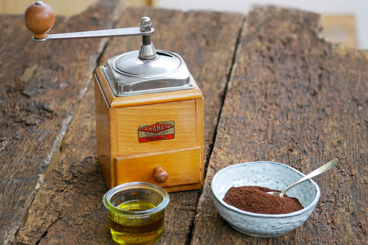 Den Kaffeesatz in eine Schüssel füllen und das Olivenöl hinzugeben.
