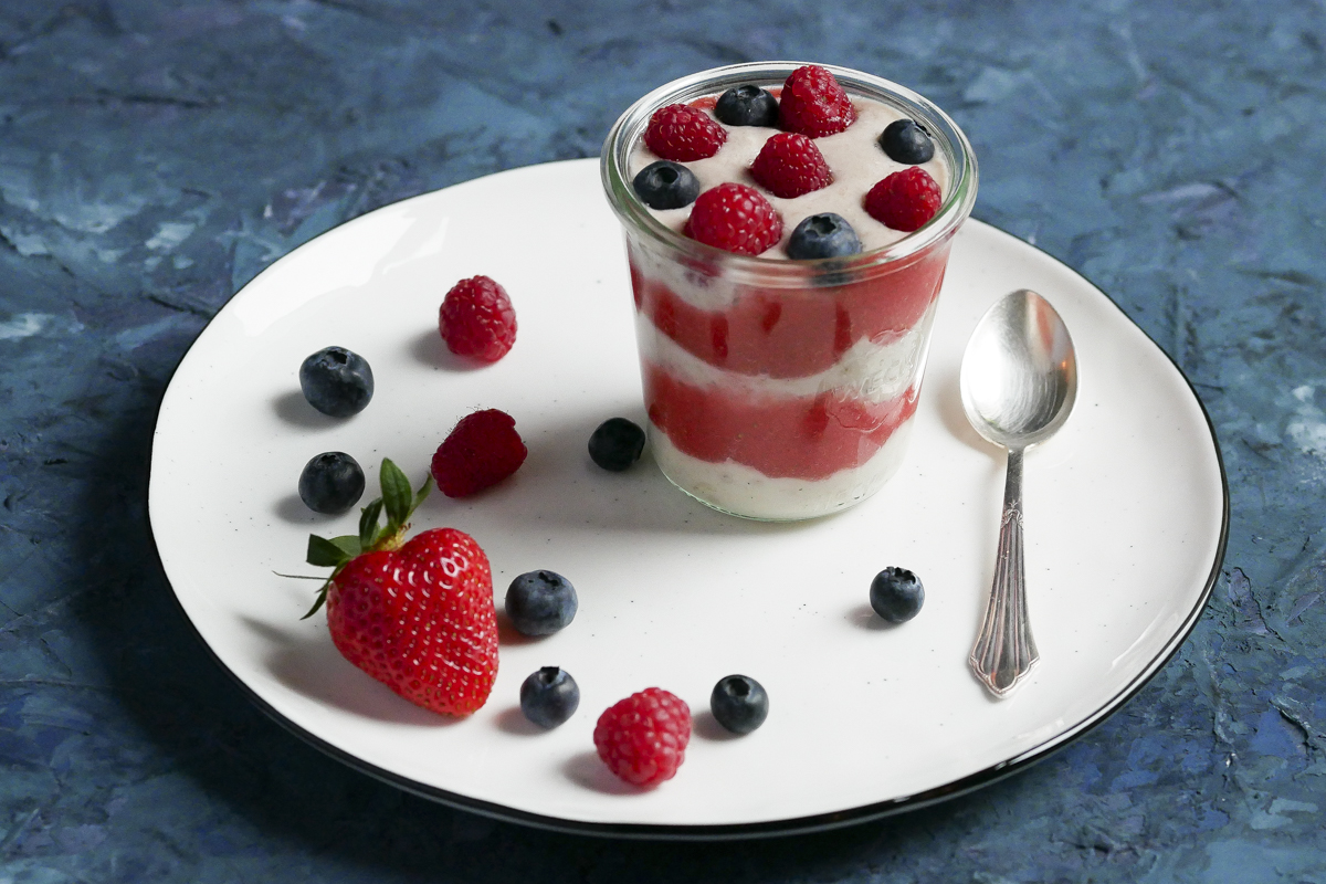 Die Bananen schälen und pürieren. Anschließend den Cashew-Joghurt, Agaven Dicksaft und eine Vanilleschote hinzugeben. Die Erdbeeren waschen und pürieren. In ein Glas abwechselnd den Bananen-Cashew-Joghurt und das Erdbeerpüree füllen, sodass verschiedene Schichten entstehen. Zum Schluss die Nachspeise mit Blaubeeren und Himbeeren dekorieren.