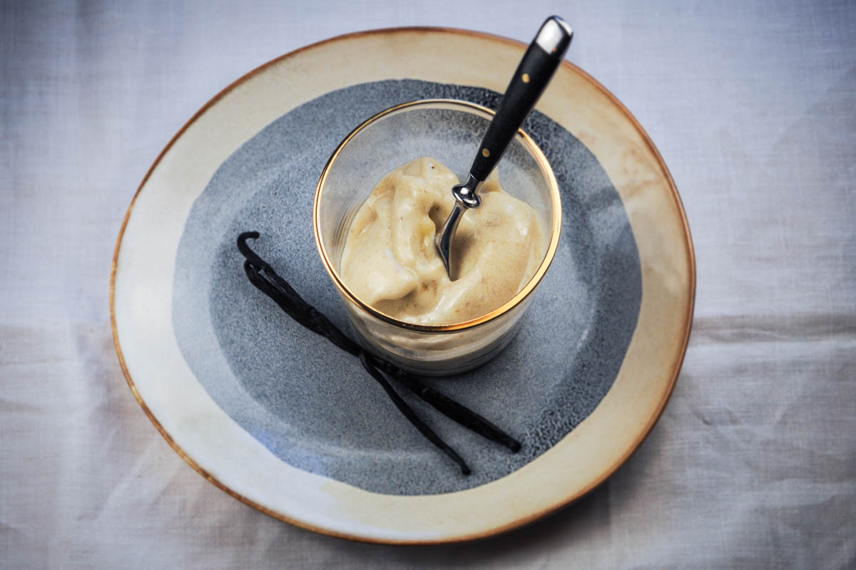 Als Basis für das vegane Eis dienen gefrorene Bananen. Am besten schmecken reife Banenen, da sie besonders süß sind. Lasse sie daher am besten ein paar Tage liegen bevor du sie einfrierst! Am nächsten Tag kannst du die gefrorenen Bananen mit einem Stabmixer zerkleinern bis eine cremige Masse entsteht. Jedoch nicht zu lange mixen, damit das Bananeneis seine cremige Konsistenz behält! Je nach Belieben können nun zum Beispiel Kakaopulver, Espresso, Vanillepulver oder gemahlene Nüsse unter die Masse gehoben werden. Auch Früchte und Beeren eignen sich super und können direkt mit den Bananen zusammen püriert werden. Ist das Eis noch nicht süß genug, kann etwas Ahornsirup oder Fruchtsaft hinzugegeben werden.