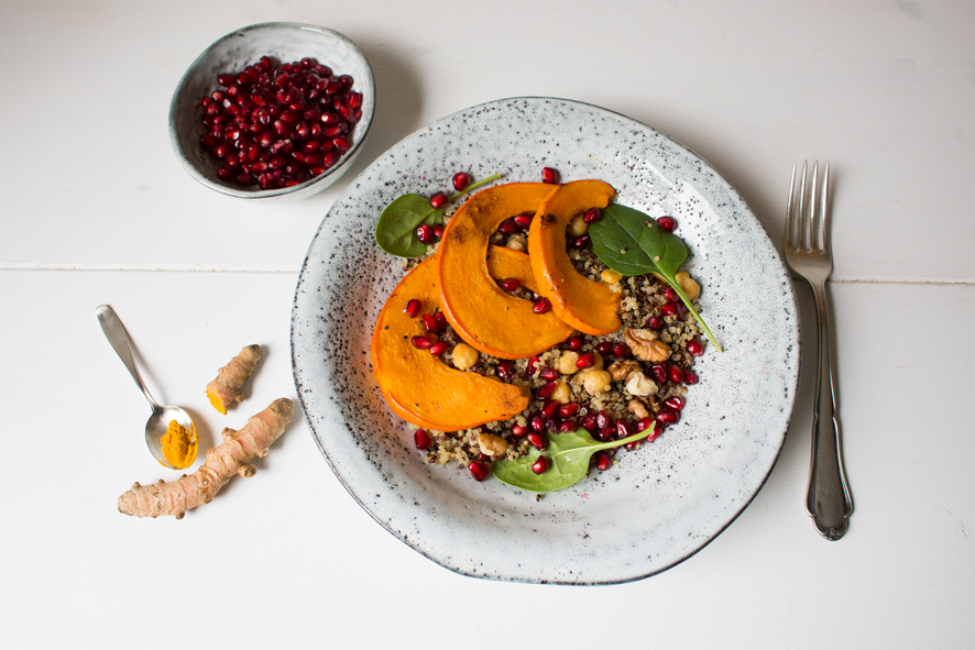 Den Backofen auf 200 Grad vorheizen. Kürbis waschen, die Kerne entfernen und den Kürbis klein schneiden. In einer Schüssel den Kürbis mit 4 EL Olivenöl, Salz und Pfeffer und 2 TL Kurkuma würzen. Den Kürbis auf ein Backpapier ausgelegtes Backblech legen und 30 Minuten im Ofen rösten. Bunten Quinoa in einem Sieb waschen. Mit der doppelten Menge an Wasser in einen Topf geben. Einmal aufkochen lassen und dann den bunten Quinoa bei schwacher Hitze für 15 Minuten köcheln lassen. Kicherebsen in einem Sieb waschen. Mit 1 EL Olivenöl, 1 TL Kurkuma, 1 TL Kreuzkümmel sowie Salz und Pfeffer würzen. Pfanne mit 1 EL Olivenöl erhitzen, Kichererbsen hinzugeben und ca. 6 Minuten anbraten. Kerne aus dem Granatapfel lösen. Walnüsse hacken. Babyspinat waschen. Kürbis aus dem Ofen nehmen und alle Zutaten zu dem Quinoa geben und vermischen.